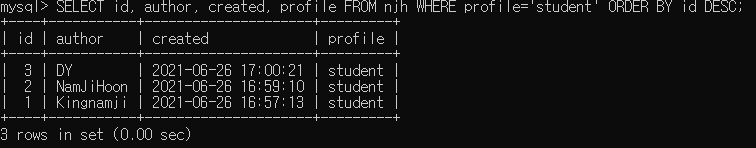 위의 예시에서는 ORDER BY id DESC를 통해 id 칼럼을 기준으로 내림차순으로 정렬을 했고, profile 칼럼의 데이터가 'student'인 데이터만 SELECT 했습니다.
