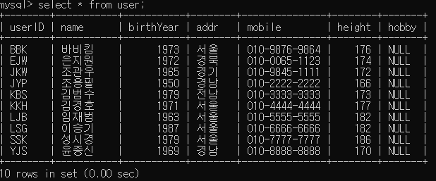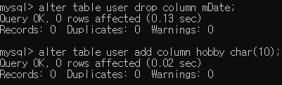 결과를 확인해보면 mDate 열은 사라지고, hobby 열은 추가돼 NULL 값으로 채워졌습니다.