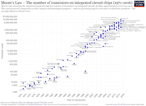 약 18개월~24개월 주기로 칩의 집적도가 약 2배씩 상승한다는 말이다. 즉, 트랜지스터가 두배씩 증가한다.