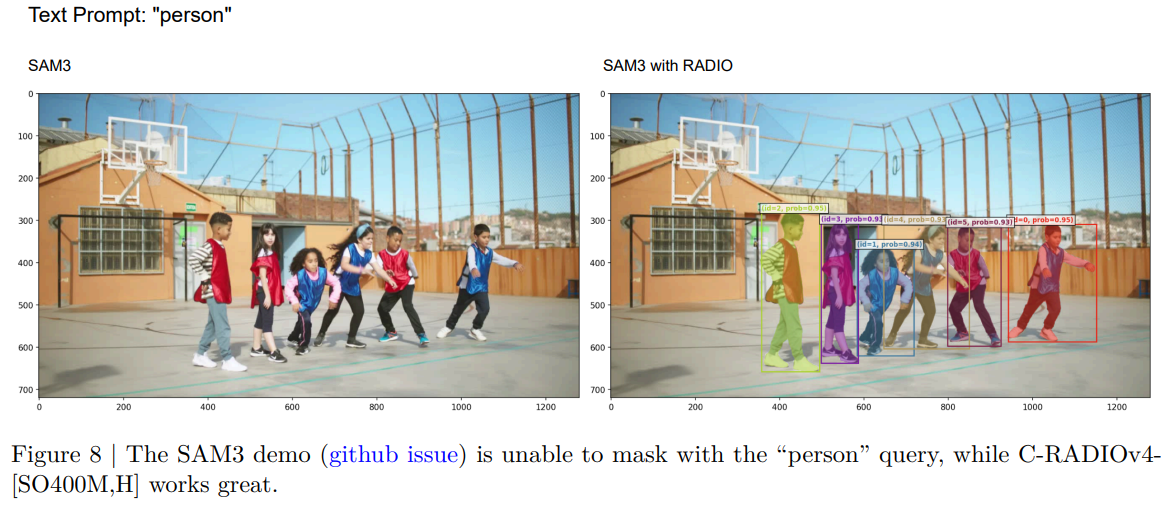 추가로, SAM3 공개 코드에는 'person' 쿼리가 제대로 작동하지 않는 버그가 있으나, C-RADIOv4로 Backbone을 교체하면 이 문제가 해결되는 것을 확인할 수 있다.