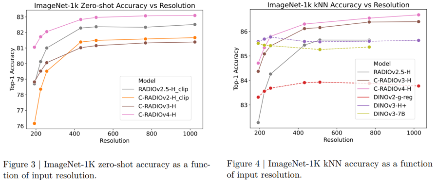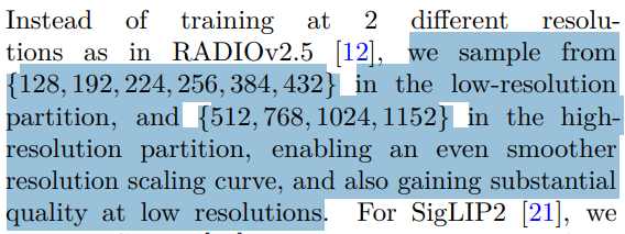 기존 RADIOv2.5이 두 개의 고정된 해상도로만 학습했던 것과 달리, C-RADIOv4는 다양한 해상도를 샘플링해 학습하는 방식을 도입했다.