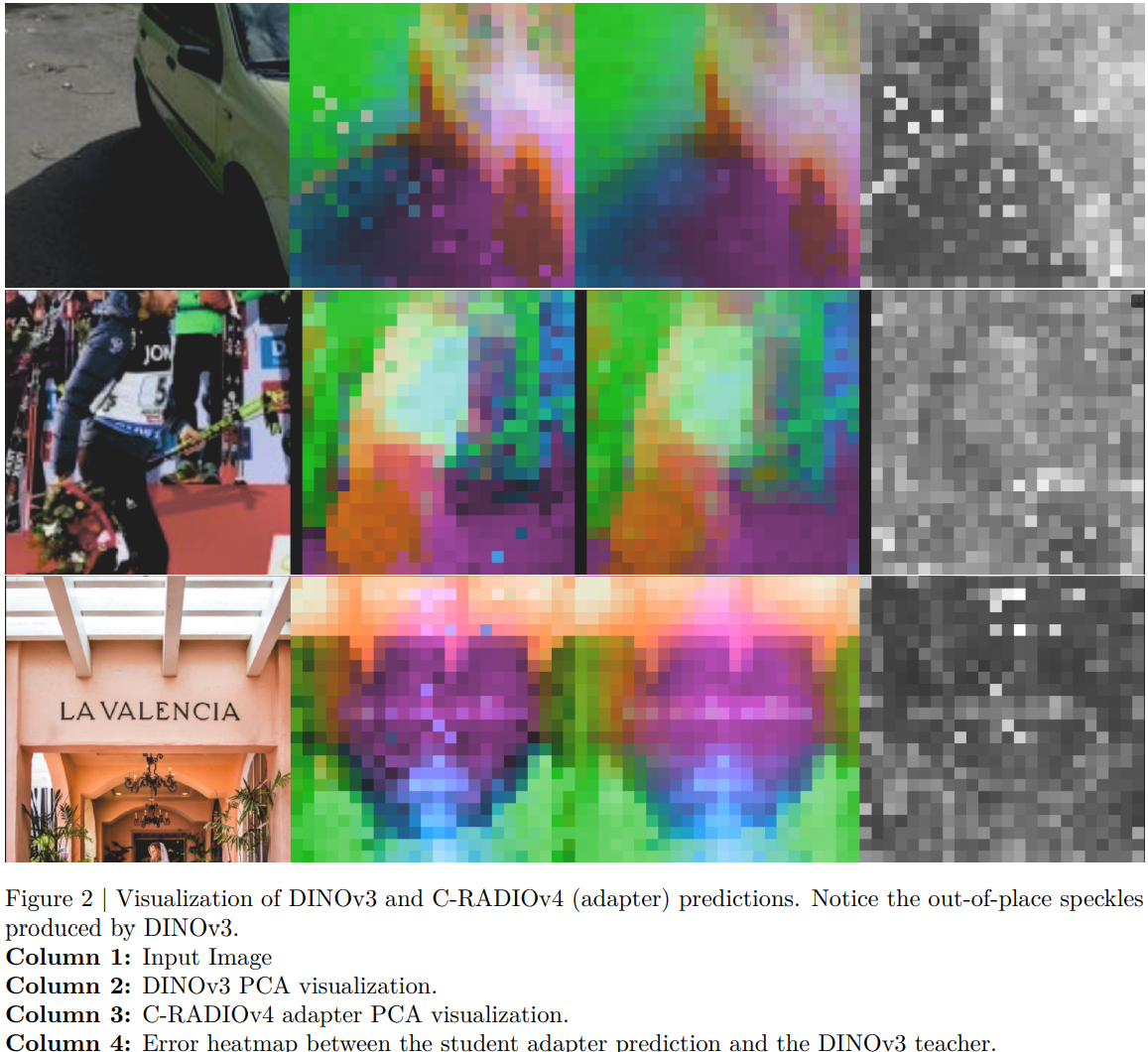 Teacher model인 DINOv3가 가진 고질적인 Fixed pattern noise가 해결된 것도 확인할 수 있다. (장점만 학습)